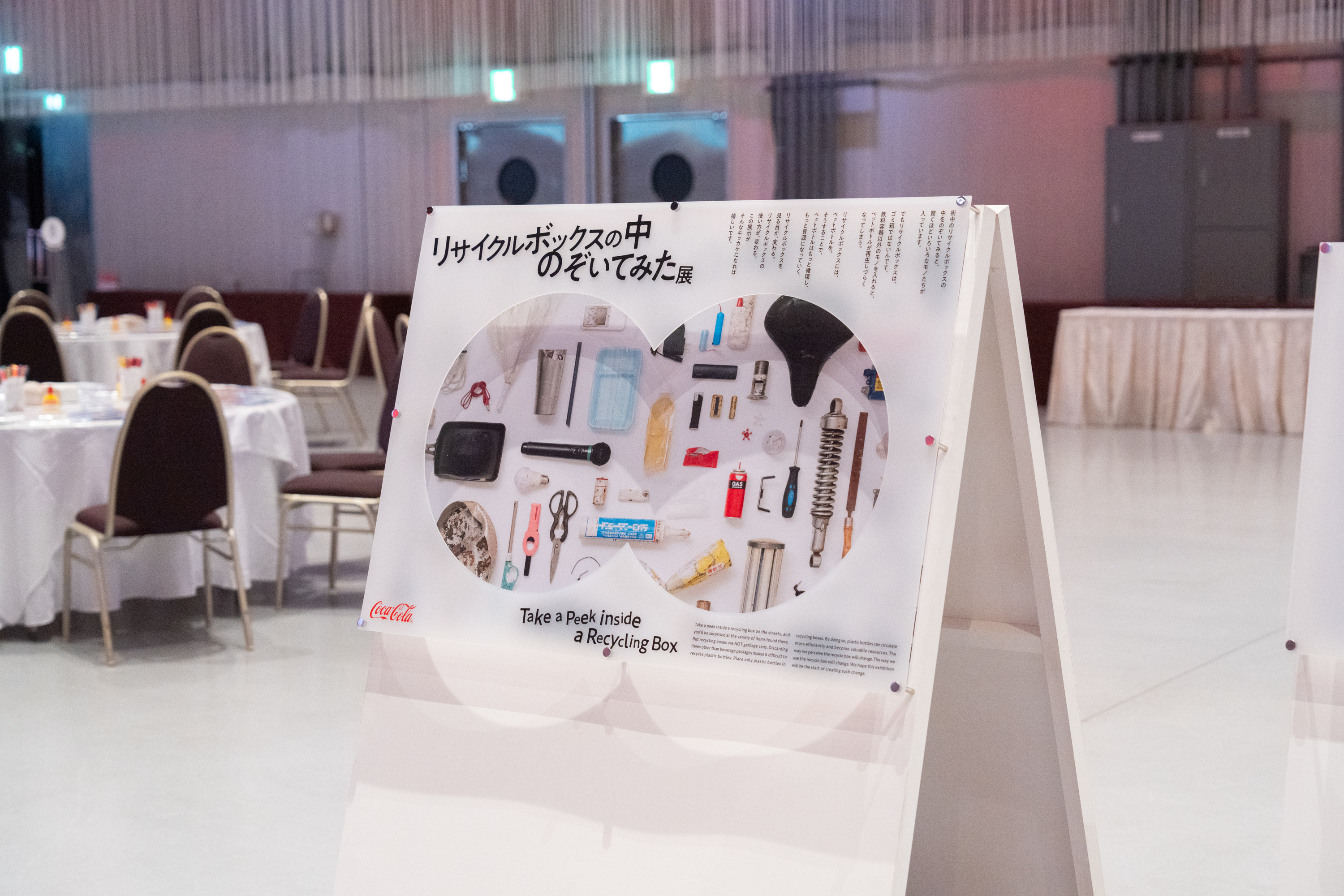 会場では、「リサイクルボックスの中のぞいてみた展」も実施。これは、2023年のリサイクルの日にコカ・コーラが開催した展覧会形式のイベントで、街中のリサイクルボックスから実際に回収された、PETボトル以外の“ありえない廃棄物”の写真を展示したものです。
