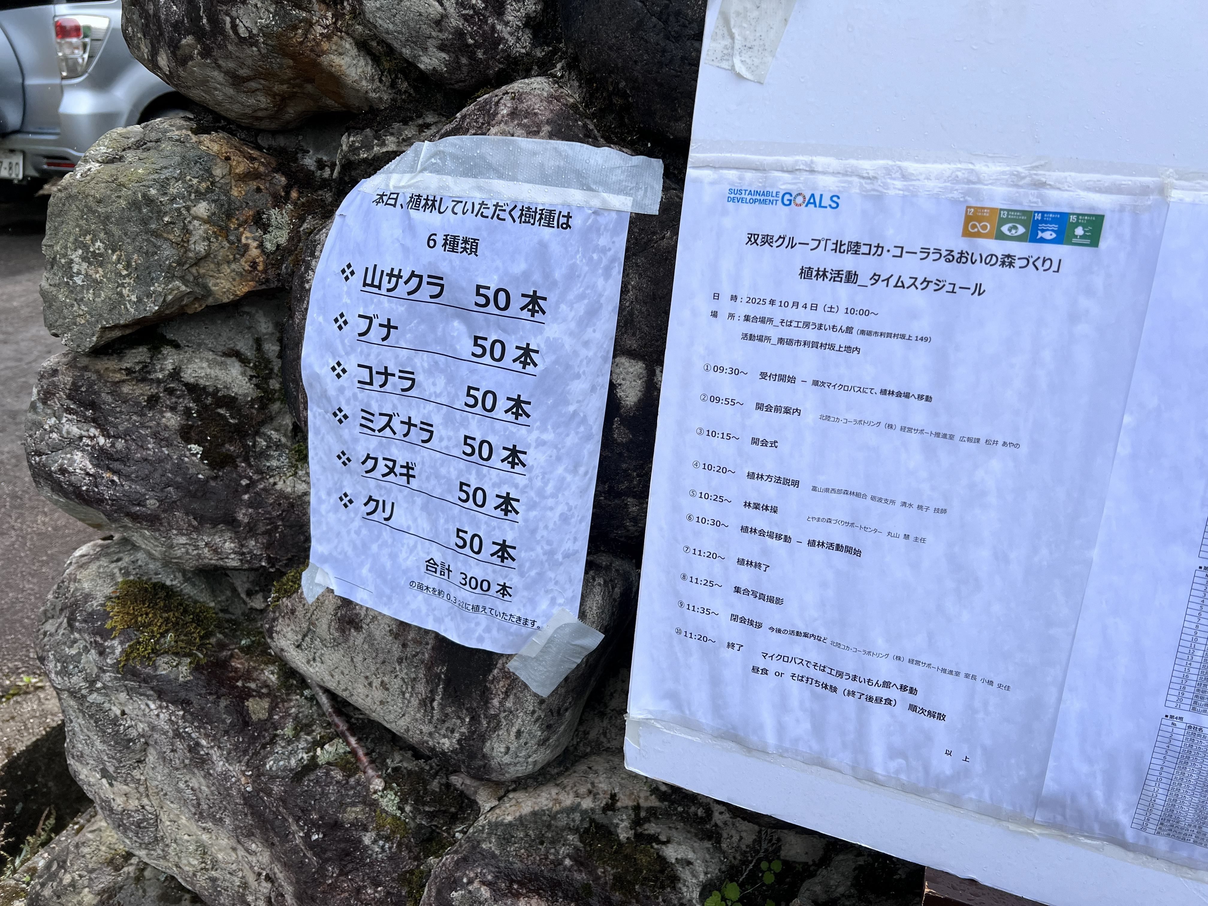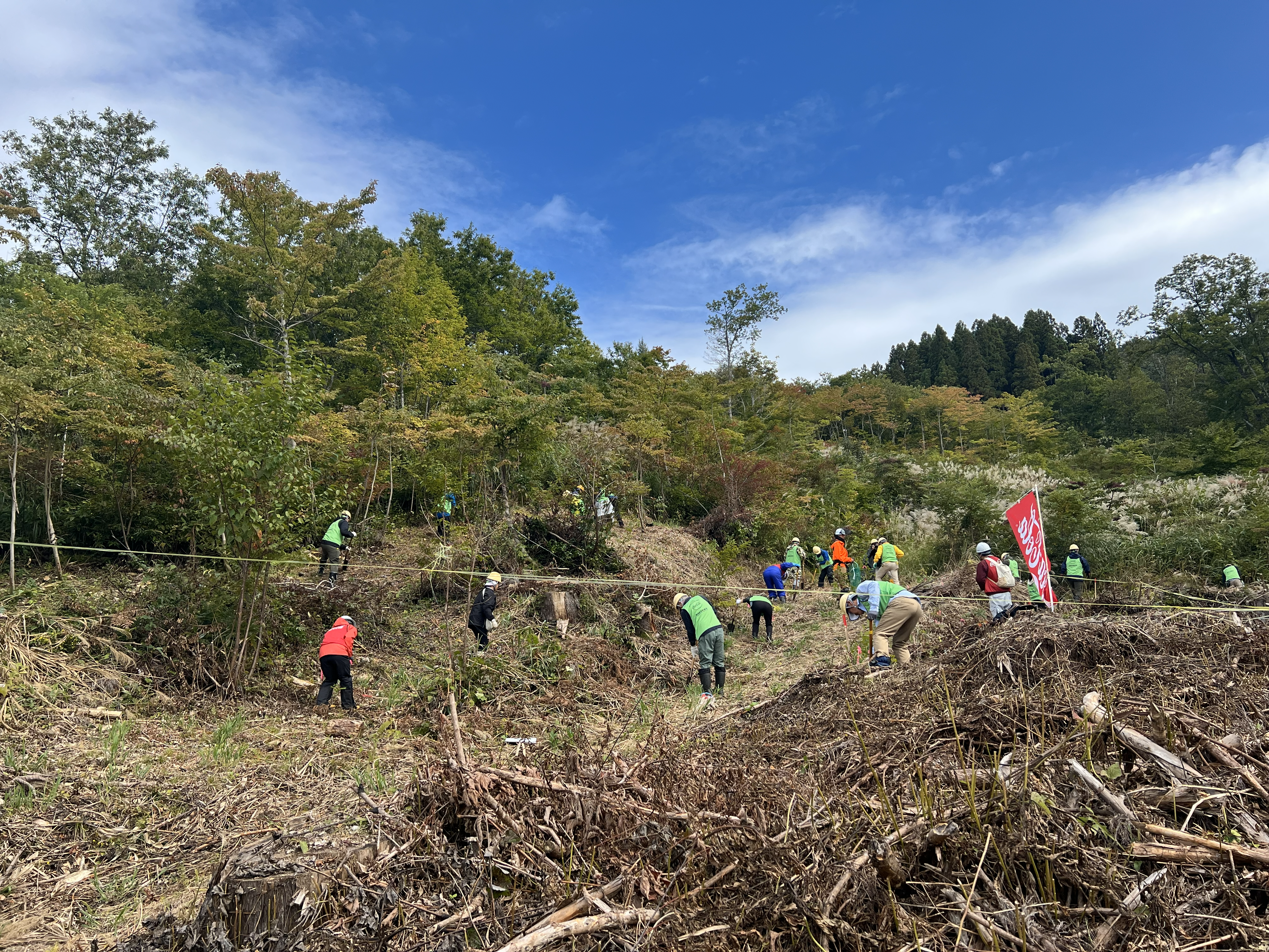 10月4日に行われた2025年の植樹活動には、北陸コカ・コーラボトリングはもちろん、有志の会のメンバーや南砺市職員、富山県西部森林組合などが参加し、森林組合の職員の指導のもと、山中にヤマザクラやブナ、コナラ、ミズナラ、クヌギ、クリなど300本の苗木を植えました。
